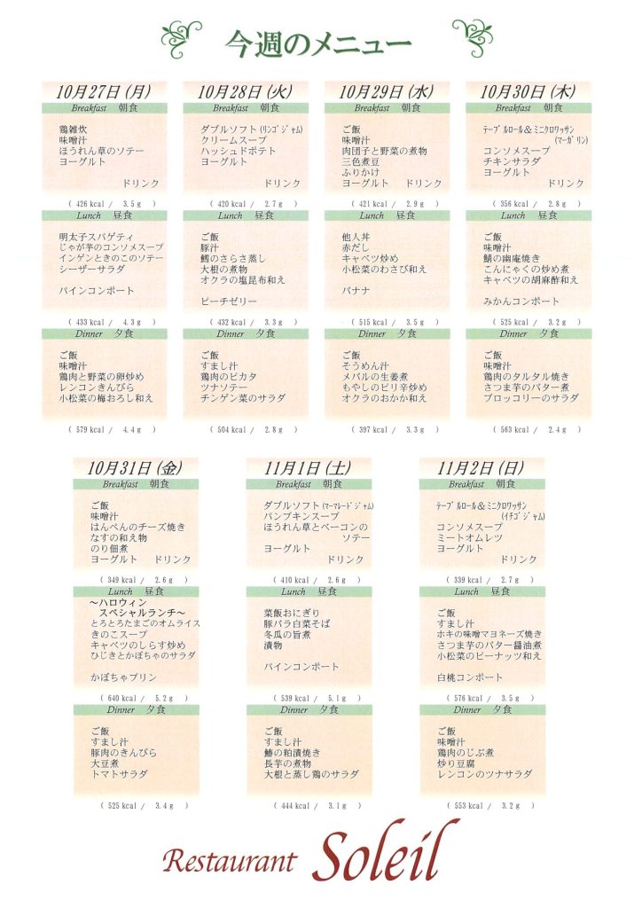 10月27日~11月2日のメニュー表です。