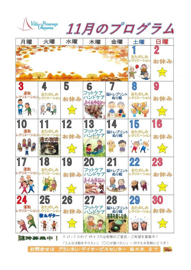 トップ > 11月のプログラム 2025.10.31 お食事メニュー 11月のプログラム 11月のプログラムができました。 ゲスト様に喜んで頂けるよう計画しています。 前の記事 お知らせ一覧に戻る 高級ホテルのような住まい ご利用料金 介護でお困りの方へ 資料請求 Copyright (C) 2017 ヴィラ・プランタン おかやま. All Rights Reserved.