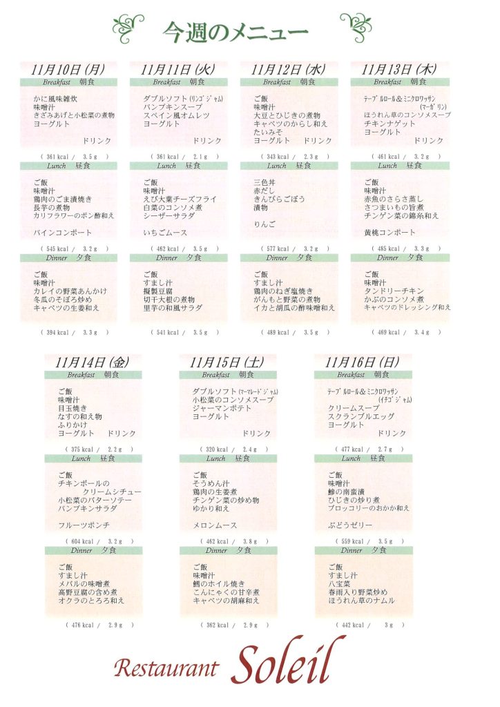 11月10日~11月16日のメニュー表です。