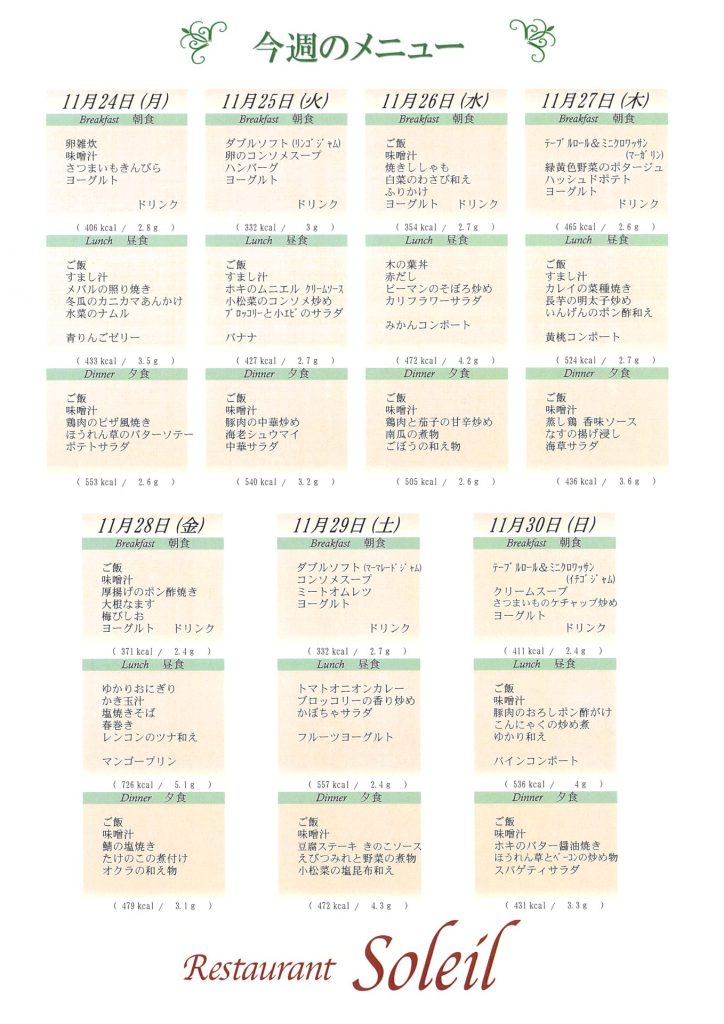 トップ > お食事メニュー(11/24~11/30) 2025.11.19 お食事メニュー お食事メニュー(11/24~11/30) 11月24日~11月30日のメニュー表です。 前の記事 お知らせ一覧に戻る 高級ホテルのような住まい ご利用料金 介護でお困りの方へ 資料請求 Copyright (C) 2017 ヴィラ・プランタン おかやま. All Rights Reserved.