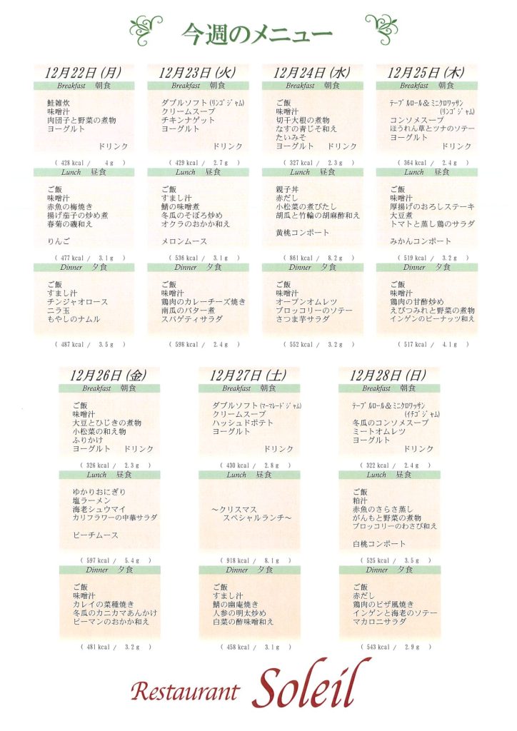 トップ > お食事メニュー(12/22~12/28) 2025.12.17 お食事メニュー お食事メニュー(12/22~12/28) 12月22日~12月28日のメニュー表です。 前の記事 お知らせ一覧に戻る 高級ホテルのような住まい ご利用料金 介護でお困りの方へ 資料請求 Copyright (C) 2017 ヴィラ・プランタン おかやま. All Rights Reserved.