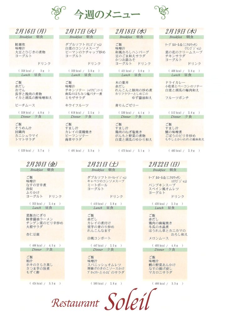 2月16日~2月22日のメニュー表です。