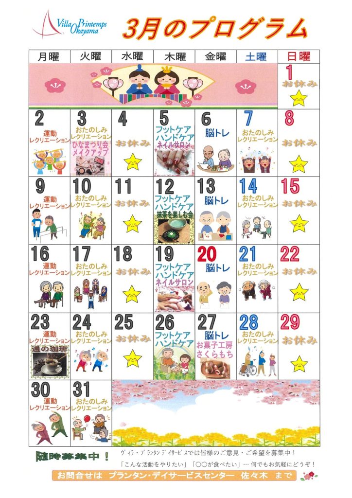 トップ > 3月のプログラム 2026.02.27 プログラム 3月のプログラム 3月のプログラムができました。 ゲスト様に喜んで頂けるよう計画しています。 前の記事 お知らせ一覧に戻る 高級ホテルのような住まい ご利用料金 介護でお困りの方へ 資料請求 Copyright (C) 2017 ヴィラ・プランタン おかやま. All Rights Reserved.